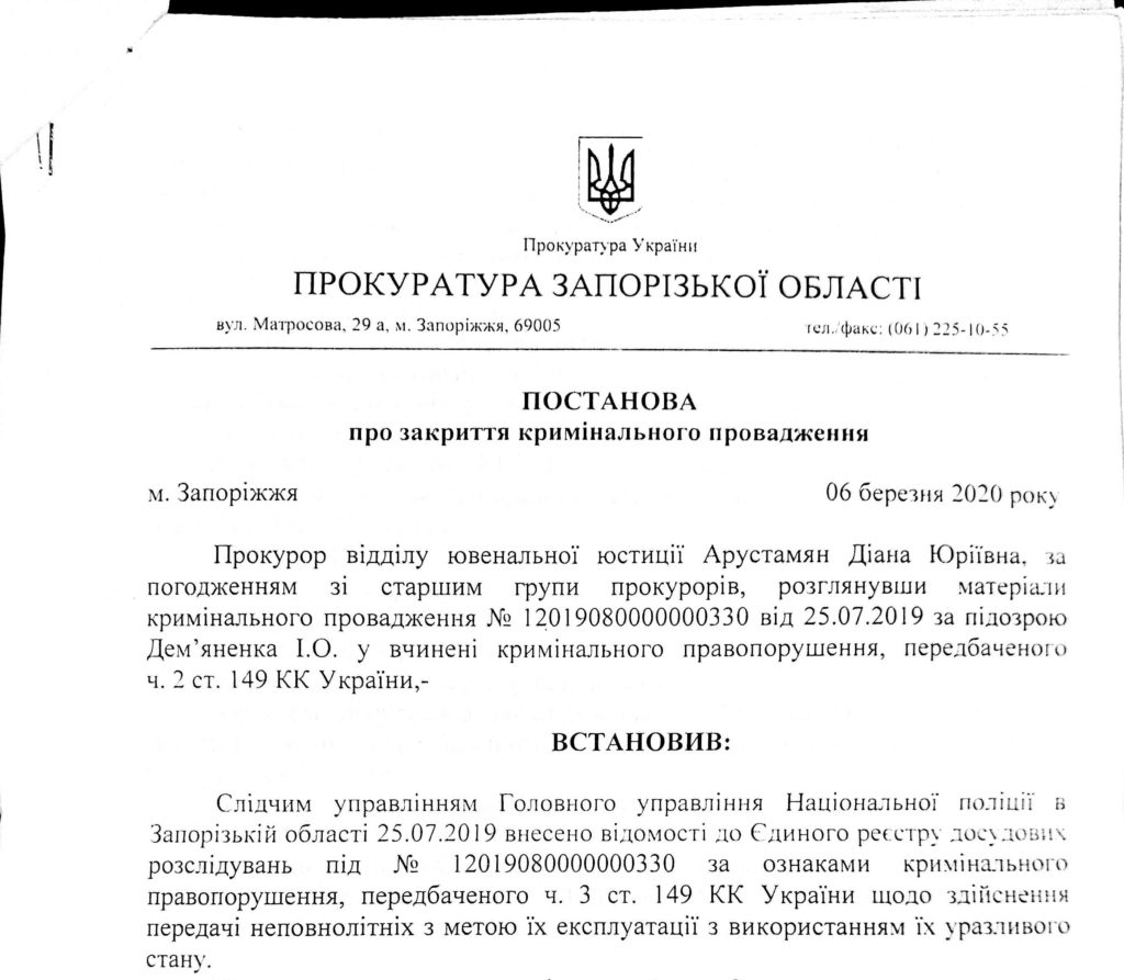 Нарешті отримано Постанову Прокуратури Запорізької області, текст якої говорить: «Таким чином, зібрані органом досудового розслідування докази є недостатніми для складання обвинувального акту відносно Дем’яненка І.О. у вчинені злочину, передбаченого ч. 2 ст. 149 КК України, а можливість отримати додаткові докази наразі вичерпано.