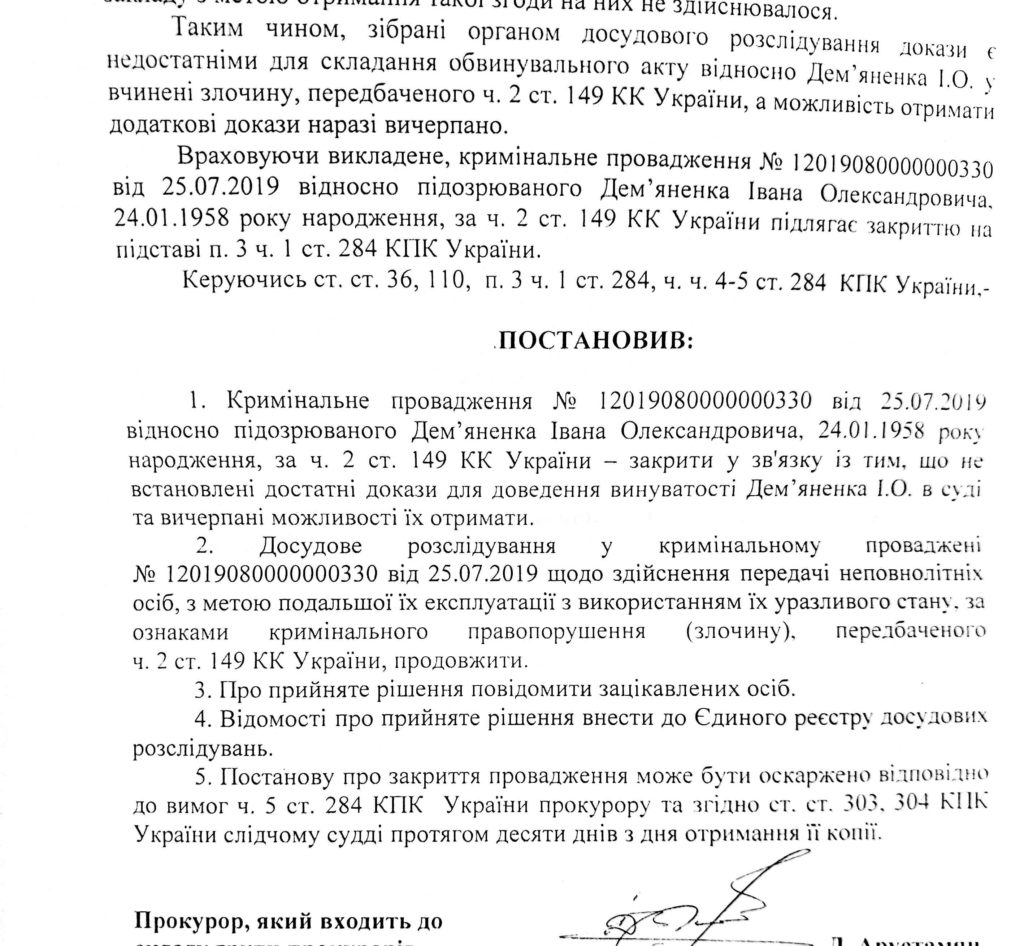 Враховуючи викладене, кримінальне провадження № 12019080000000330 від 25.07.2019 відносно підозрюваного Дем’яненка Івана Олександровича. 24.01.1958 року народження, за ч. 2 ст. 149 КК України підлягає закриттю на підставі п. З ч. 1 ст. 284 КПК України».